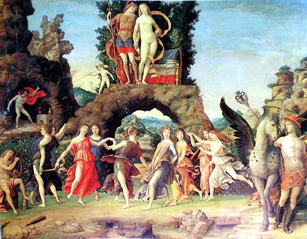 威尼斯畫派畫家曼帖那的作品-維納斯與戰神瑪斯。 畫面上方中間的兩人是愛神維納斯和戰神瑪斯,他們是情人沒錯,可以過情人節,但畫面左方遠處那個穿紅披風的人是維納斯的本夫火神,他可不高興呢!