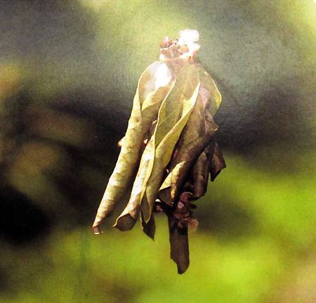 避債蛾的幼蟲孵化後,遠古傳下的基因讓牠們馬上開始搜集枯葉和植物的碎屑,做成一個像睡袋的家,然後就躲進那個睡袋。