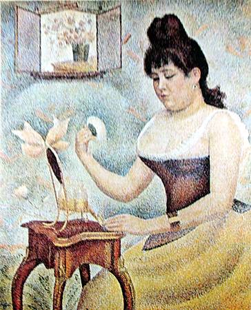 相較其他當代畫家紛亂又多彩的男女關係,秀拉的感情生活相當貧乏。內向的秀拉一直未婚,將近三十歲才交到一個女朋友馬德蓮(Madeleine Knobloch),馬德蓮是個不識字的女工,人也很粗俗。一開始秀拉要求馬德蓮當他的模特兒,不久兩人就同居。《撲粉化粧的女子》就是秀拉以馬德蓮為模特兒的畫作,從畫上可以看出她姿色平庸,而且相當肥碩。