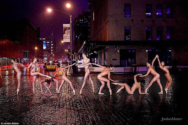 美國紐約曼哈頓攝影師麥特(Jordan Matter)為了新書《午夜後的舞者》(Dancers After Dark,暫譯),在世界各地景點拍攝裸體芭蕾舞者姿態,最近一次在華盛頓廣場公園拍攝。