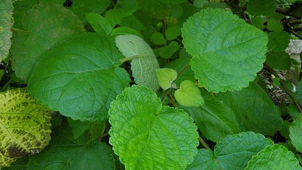葉十字對生,無托葉,具長柄,柄長 3~10 公分,葉片隨著季節或溫度會有變化;冬季葉小,春夏葉大,葉有圓形、卵圓形、三角狀圓形,長寬各約 3~10 公分;先端鈍圓,基部心形,粗鋸齒緣,中脈明顯,上下葉面被疏茸毛,下表面葉脈極明顯。