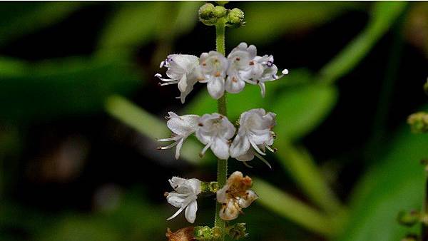 圓錐花序、頂生,花兩性;花梗長約 30~100 公分,紫紅色,疏生茸毛;萼片5,合生,不整齊;花瓣5,合生;花冠徑 0.3~0.35 公分,白色至淡紅白色;雄蕊4,瓣上著生;心皮2,合生,子房上位,通常4 裂,花柱基生。花期 2~4 月。果實為4 小堅果。