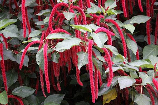 花:葇荑花序,開於莖頂,彎曲而下垂,開花呈串,整朵花序由無數的鮮紅色小花所組成,毛絨絨的外觀,看起來就像「狗尾巴」一樣,外形特殊別緻,有如「狗尾草」一般。花期春至秋季。