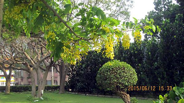 廟在山上,藉左側石階和坡道上山,坡道旁有幾棵阿勃勒此時正盛開。台灣的阿勃勒樹齡都不大,雖也有一叢叢的黃花,但總嫌不夠壯觀,不像老樹如同華蓋,隨著橫生的枝椏,人們入眼是一樹的黃、黃的那麼恣意,綠色祇能點輟其中;盛開時遍地落花與樹上的黃相互輝映,令人感嘆大自然的美麗。