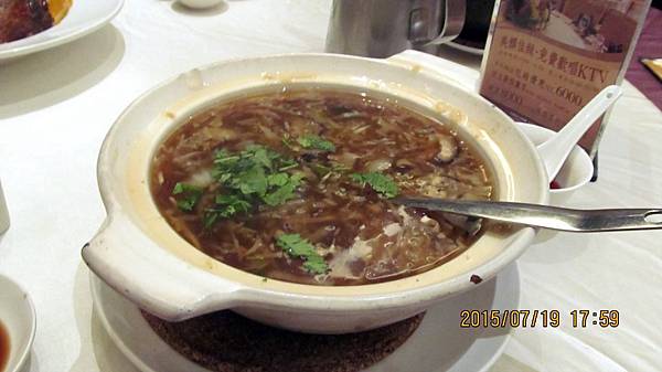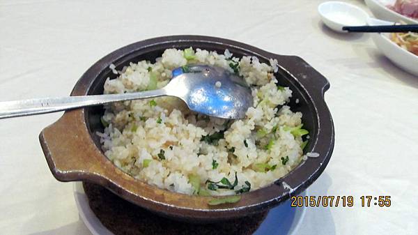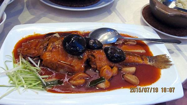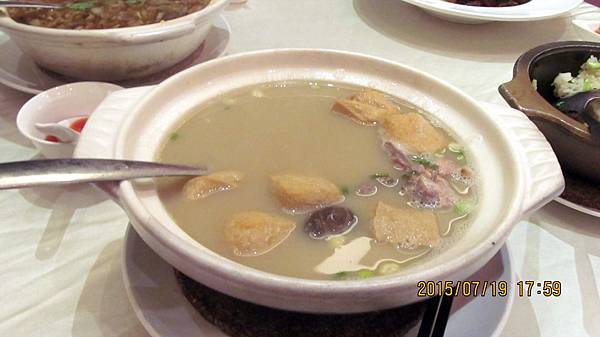 因為兒子和媳婦今天中午有喜帖,喜宴吃到三點才結束,還不很餓,結果九菜一水果的份量太多了,砂鍋油豆腐雞湯、砂鍋魚翅盅、蒜燒黃魚還剩下大半,於是就打包了。