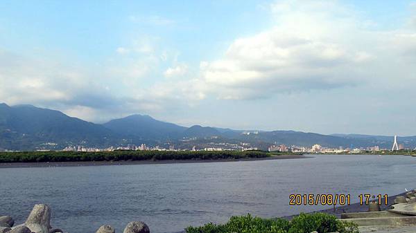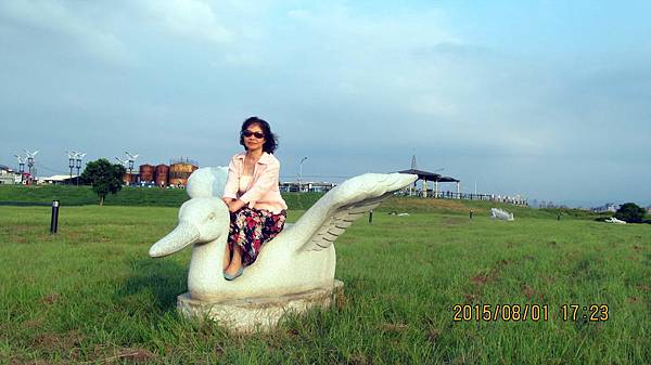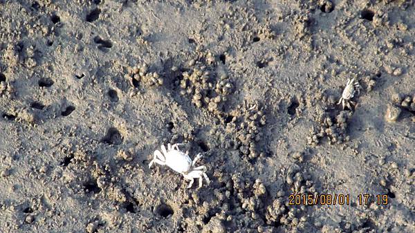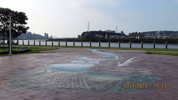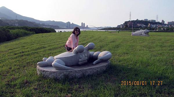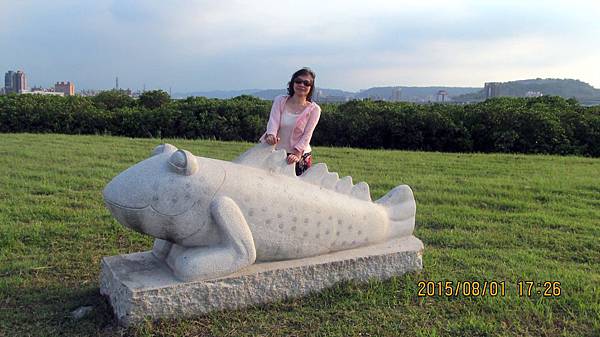 如今堤防已整建為自行車道,那天看到不少老老少少騎車健身,幾乎都不是U-bike,奇怪的是也沒看到腳踏車出租店,那地方如不是租車要弄部腳踏車去健身想必不容易。那片草原依舊,草原中多舖了幾條人行步道,也多了三座大理石的石雕,一隻彈塗魚,一隻螃蟹,還有一隻水鳥,還有三D的造景彩繪。當然,都幫阿芬拍了。當年髒亂的河岸已整治的相當乾淨,一大片泥地,可以看到無數的招潮蟹,人來就躲進洞裡,然而小傢伙沒多少耐性,祇要妳靜止不動,不必十秒鐘,牠又冒出來了。也看到稀疏的幾株水筆仔,兩個月前在竹圍拍了開花的水筆仔,如今花期已過,祇剩下花蒂,小水筆仔還沒長出來。這裡可能因為紅樹林不夠茂密無法遮陰,看不到彈塗魚。由堤防變身的腳踏車道沿著社子島的前沿繞島大半圈,很想走一段,阿芬卻沒興趣,於是走出來搭車回大橋頭。