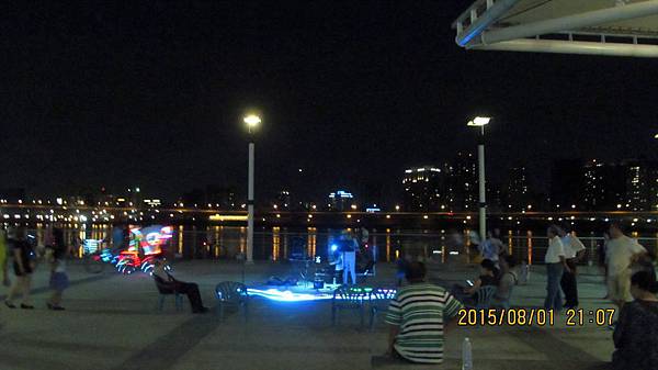 這次來場子更多了,形形色色的表演者為了競爭更加賣力。這天人很多,數百人分散在不同的場子,捧場的大多是老男老女,少數的年輕人騎著閃著一串串燈炮的單車聚在水門前,不知為何逗留,也不見他們騎動。遠方的台北橋亮著霓虹燈,點綴在黑夜的淡水河上,然而沒人會在意今晚是否月圓,沒人是來賞夜景的,不甘寂寞的老男老女來這裡祇為了和異性廝混,證明自己還能抓住青春的尾巴。