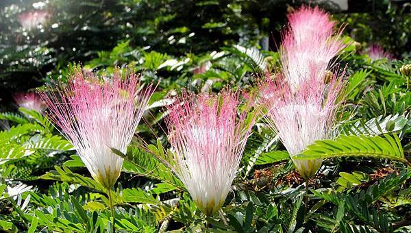 粉撲花(粉紅合歡、蘇利南合歡)、紅粉撲花、艷紅合歡的花粗看都很像,但樹形外觀和葉子的形狀全然不同。