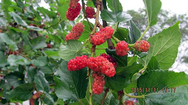 今年很多花都開了兩次,桑樹也又結出桑椹。桑樹原本一年就會結兩次果,農曆年後的結果是正常果期,桑椹結的多,果也大。入冬時天氣轉寒會再結一次,但果小量也少。今天看到春光公園的那兩棵桑樹卻長滿了桑椹,顆粒都不小。幾天後應該就會成熟轉黑。我們這兒上公園的人們很喜歡摘桑椹,想來輪不到我去摘。