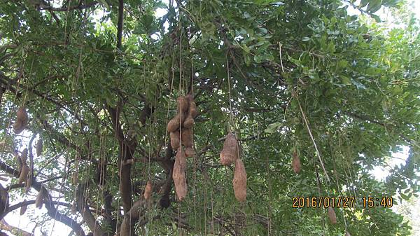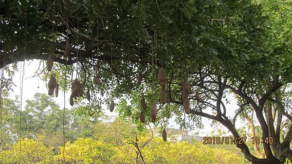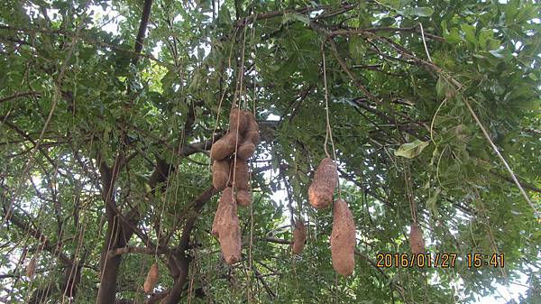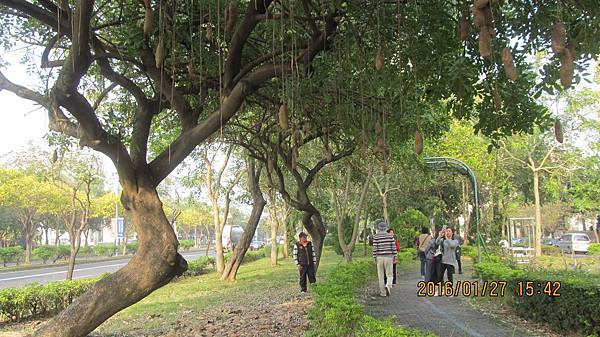 遊覽車的行程表裡有紫花風鈴木的行程,我知道風鈴木有黃花和紅花兩種,卻不知道還有紫花;上網查的結果很有意思,圖片檔的照片分明都是紅花風鈴木(洋紅風鈴木),然而部落格文章介紹的又都是藍花楹,於是我很好奇遊覽車要帶我們去看的到底是藍花楹,紅花風鈴木,還是真有紫花風鈴木?(蝶戀花公司有過藍花楹的行程,也有過紅花風鈴木的行程,所以我想排行程的王小姐應該不會搞混)那天司機原本也信誓旦旦說沒問題,就在嘉義啟智學校附近,然而車子經過世賢路二段的啟智學校,遊覽車轉入慢車道,沿路找著就是沒找到。後來司機把車停在路邊,問了當地住戶確定花還沒開,於是又打電話回公司,聯絡後公司決定補個景點:去看臘腸樹。