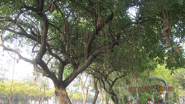 車子繼續往前開沒多久,由世賢路二路上行到一段,臘腸樹就在嘉義世賢國小前的分隔島上。巧的很,去年底我買了章錦瑜女士一套三本介紹花木的書,日前才在書中看到臘腸樹,當時怎也不會想到沒過幾天竟然實地看到。臘腸樹是熱帶樹種,台灣雖然有種,但並不普遍,北部更少,活了六十幾歲之前從沒看過。