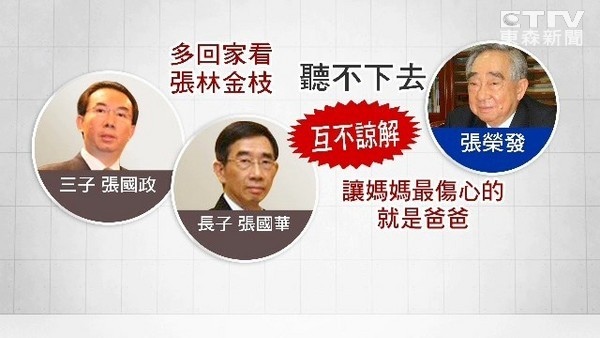 長榮集團前總裁張榮發上月過世,遺囑日前曝光,讓大房長子張國華等三兄弟與二房獨子張國煒之爭,浮上檯面。大房體系企圖裁撤張國煒總裁職務,讓張國煒怒批,3位遺囑執行人明知內容,卻遲遲不公布,是不忠不孝。據親友透露,大房元配張林金枝晚年時,三子張國政多次提醒張榮發回家探視,但他都沒聽進去。甚至連張國華都曾說,讓媽媽最傷心的就是爸爸。