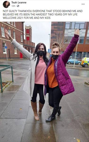 初審獲判無罪,辣媽 (左) 第一時間與親朋好友分享好消息