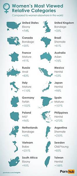 今天在臉書上看到世界最大的色情網站《PornHub》統計了不同國家的女性上他們的網站搜尋的字眼,發現一個有趣的現象,亞洲女性最聰明,胃口也最大。相對美國、南非女人搜尋最多的是「黑人」,法國、義大利女人搜尋「成人」,俄國女人搜尋「肛交」,德國女人搜尋「戀物癖」,波蘭女人搜尋「母子交尾」,亞洲女人搜尋的字眼是「變態」(Hentai),「變態」包括所有項目。
