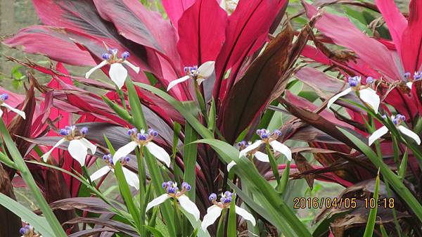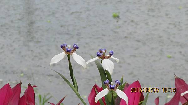 在湖的東側步道旁,看到幾株吉野櫻,都是種沒多久的小樹,祇有一株開花,花也不多,今年櫻花的花況都不好。也看到一棵珊瑚刺桐,小小的一棵,在春末夏初不甘寂寞的竄出一串紅花。湖畔的一角種了一小片的白色藍心的鳶尾花,此時正盛開,和一旁種的朱蕉相互輝映。