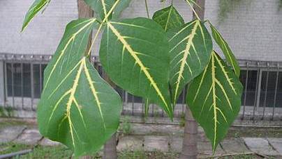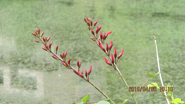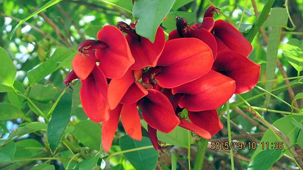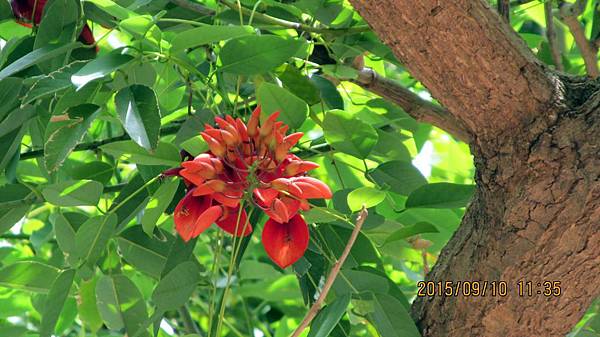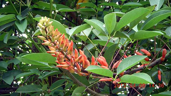 葉片主脈紋呈黃色,與綠色葉肉對比鮮明,葉為三出複葉,小葉菱形或闊卵形。花為紅偏黃。曾在大湖公園前看過,因為不是花季,所以沒照下來。