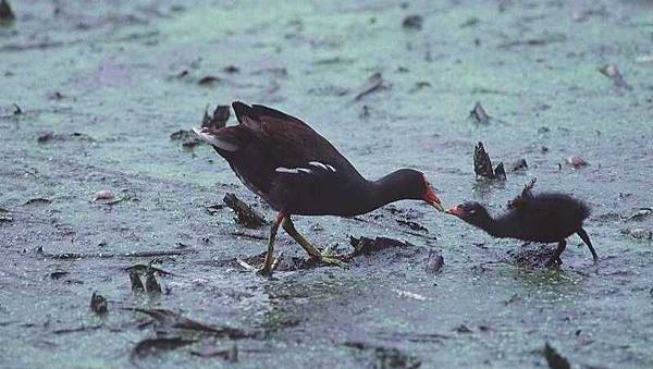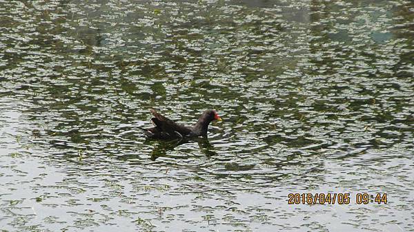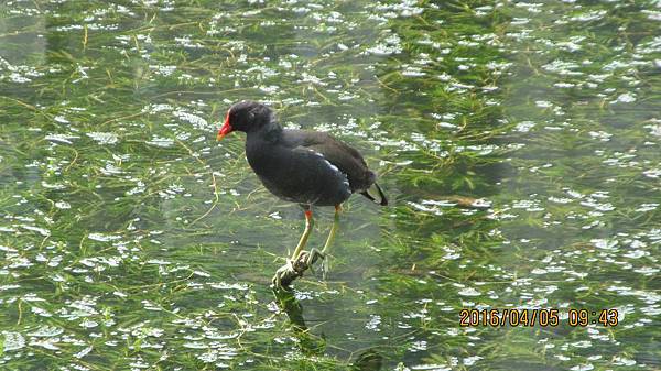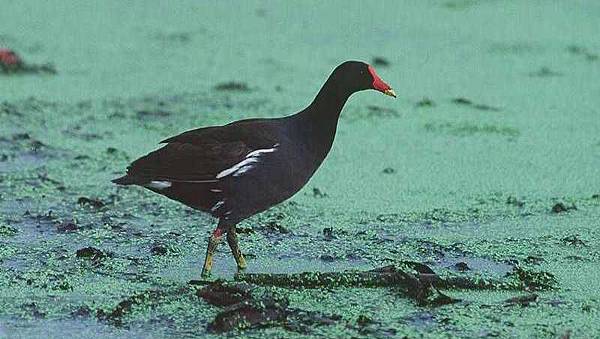 英文:Common Moorhen 學名: Gallinula chloropus。秧雞科,俗稱黑水雞。在台灣的閩南人叫她「水加令」;客家人稱她「紅骨雞」。
