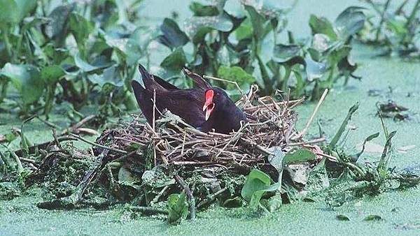 紅冠水雞通常以水草為材料,把巢築在水田邊或沼澤附近;牠們的小寶寶屬於早熟性幼鳥,破殼後就可以開始行走,跟著媽媽到處尋找食物。每年到了四、五月間,我們可以在鄉間的水田或池塘附近,發現紅冠水雞媽媽,身後亦步亦趨地跟著一列小雞路隊,在泥灘上四處走動。由於剛出生的小雞覓食技巧尚未純熟,有時水雞媽媽還會輕輕地咬著食物,讓小寶寶練習取食。牠們對子女仔細照顧的程度,令人不得不感嘆母愛的偉大呢!
