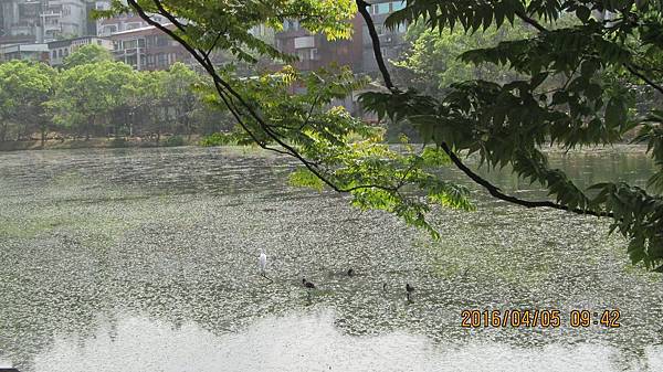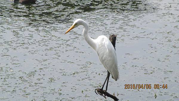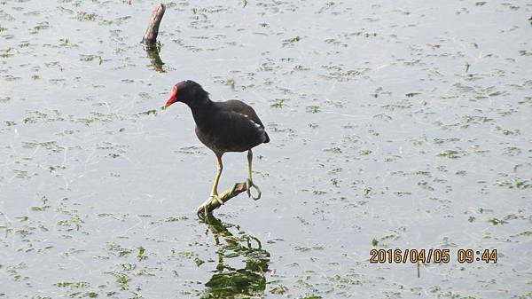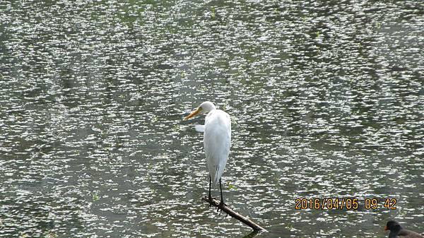 在湖中看到一隻疲憊的白鷺鷥,一直站在湖面上的枯枝,一整個小時都沒飛起,甚至動也不動。倒是一旁一對紅冠水雞一直忙著覓食。