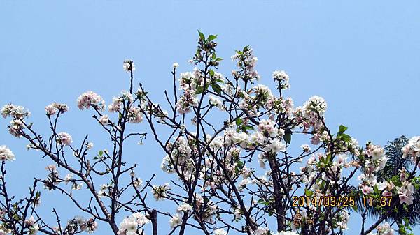 註:大島櫻是四月的晚櫻,也是白櫻。大多是的櫻花都是花先開,花謝後長葉,大島櫻是芯葉同時。大島櫻與白吉野或其他白櫻的辨識是:大島櫻的芯心被開時是綠色,而後再轉為紅色,所以叢花中有紅心也有綠心,白吉野花期較早些,而且一定紅心。