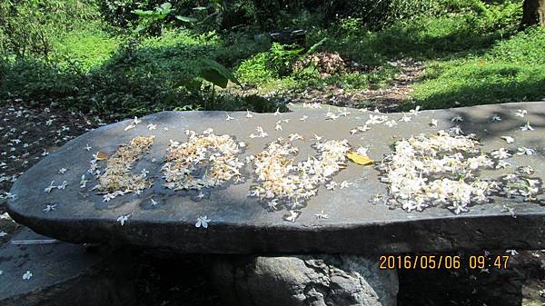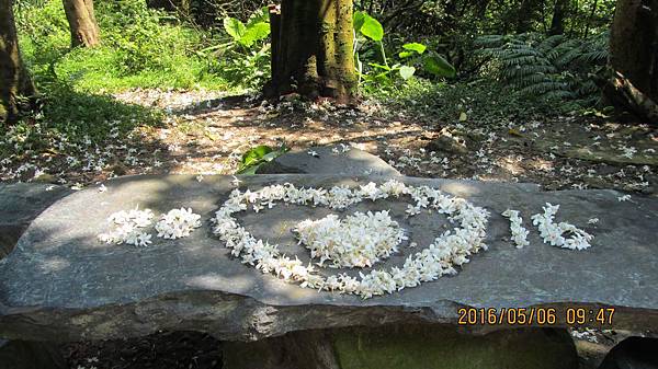 過了南天母廣場,續行幾十公尺,道路右側又有沿溪而行的步道(清溪步道、賞螢步道),遊客可選擇走承天路,或走步道。當然,我想大伙都會走溪畔步道。沿途已看不到多少桐花,即使前幾天人們在地上用落花排出來的造型(通常就是LOVE、一顆心,今年的年號2016),也被昨日的大雨打的零零落落。