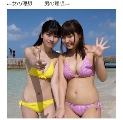 2017年日本最近一則推特貼文爆紅,網友ぽんた分享一張兩位比基尼正妹同框的照片,左邊的女生標註「女生的理想體型」、右邊則是「男生理想的女生體型」,只見照片中左邊女生身材纖細、而右邊女孩較豐腴,引發網友熱烈討論,難道男生都比較愛「肉肉的女生」嗎?