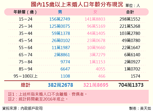 根據內政部戶政司統計,全台目前15歲以上人口中,不曾有過婚姻記錄的未婚者,即扣除已名花、名草有主的有偶者,以及曾離婚或喪偶者,一般被定義對進入婚姻仍抱持相當期待的「單身狗」,共計704萬1373人;值得一提的是,其中男性382萬2678人,較女性的321萬8695人,足足多出60萬3983人。