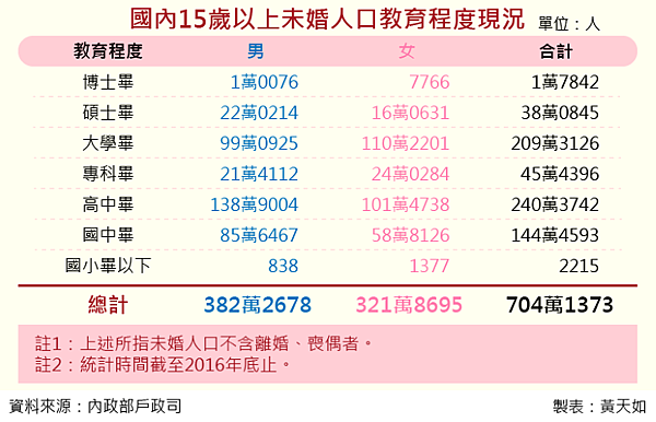 內政部戶政司統計,國內15歲以上未婚人口的教育程度現況,若以整體來看,最大宗族群集中在高中畢業共計240萬3742人,其次則是大學畢業共計209萬3126人。