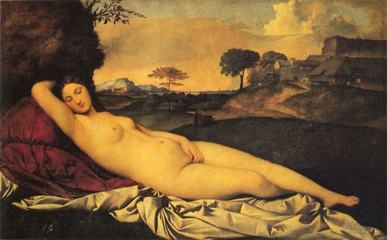 威尼斯畫派名家喬爾喬內在1510年做了《沉睡的維納斯》,是為威尼斯史上第一幅有名的正面全裸女體畫,可惜他英年早逝,33歲就歸了天,同樣師出貝里尼門下的師弟,威尼斯畫派大宗師提香,幫著補完了此畫的天空與景物部分,順便化用了此裸女造型,28年後,融進了自己《烏爾比諾的維納斯》裡,用來應付烏爾比諾爵爺的委託約稿,當然,在那時,這畫只供烏爾比諾爵爺私藏,沒公開展過。