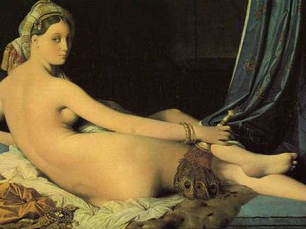 比如18世紀洛可可大家布雪,就時不常畫個《非禮歐羅巴》、《非禮麗達》,說來冠冕堂皇:題材都是希臘神話,可不是現實生活傷風敗俗哇!藉個題材,畫得嫵媚動人。到後來,學院派大師安格爾更聰明了:畫基督徒會有道德淪喪的危險,那就畫土耳其伊斯蘭教囉!當年安格爾的師父大衛,除了畫畫《馬拉之死》、《拿破崙加冕》這類史詩大作,也偶爾來個《雷卡米爾夫人肖像》之類小作品;安格爾藉師父的構圖,畫了著名的《大宮女》,多畫了些東方風情的裝飾,就讓這畫沒了道德壓力。妙在安格爾還懂得一物多用,28歲時畫了個土耳其浴女,48歲時再畫一遍;到1862年,他82歲了,把他畫過的所有裸女大團圓,來了幅《土耳其浴室》,他畫這麼多土耳其浴女都沒事,次年馬奈畫了個《草地上的午餐》,顯得像是西歐人打扮,立刻就挨道德批判,可見題材是多重要啊。