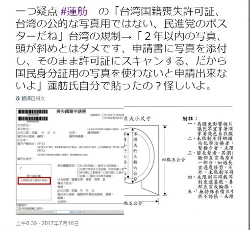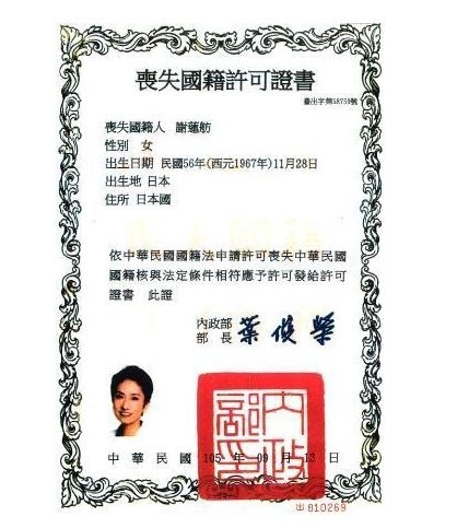 日本民進黨黨代表台裔政治人物蓮舫18日出示了台灣內政部所發的「喪失國籍許可證書」,但這個證書似乎與正常的台灣行政文書有很大的不同。有台灣網友甚至直接在網路上質疑這份文件跟本是偽造。不過我國內政部證實這份「喪失國籍許可證書」確實是由內政部所發。