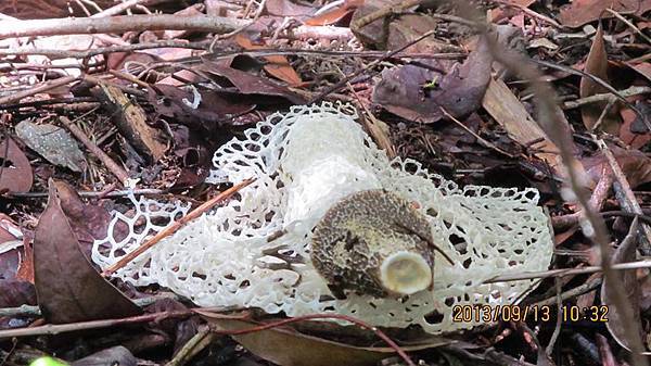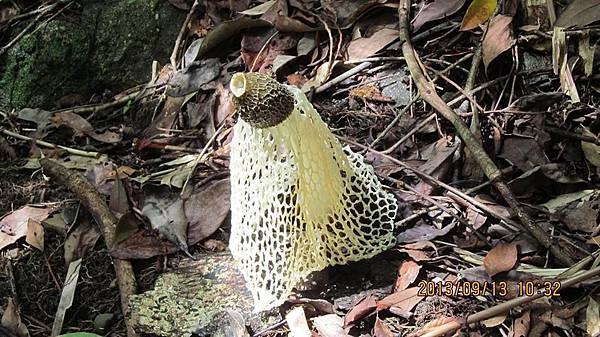三年前(102.09.13)又和小賤人坐遊覽車去了一趟明池,去明池的途中先走了三個冷僻的景點:礁溪猴洞瀑布、礁溪吳沙紀念館、礁溪武暖石板橋。前往礁溪猴洞瀑布的路上,看到山溝旁的竹林地上長出三株竹笙。竹笙是素食宴常有的一道菜,老頭對吃素沒興趣,然而職場三十多年也吃過不少飯局,偶而也吃過這個味道其實不怎樣的玩意,生平頭一次看到野生的竹笙,長的還真奇怪呢。上網查才知道:竹笙正式的名稱應該叫竹蓀,竹笙是俗稱。