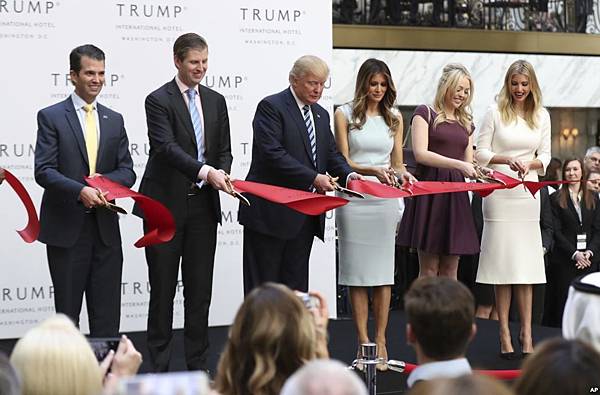 2016年10月26日,川普一家為川普在華盛頓新開張的豪華酒店剪綵。左起:川普之子小唐納德和艾瑞克,川普,夫人梅拉尼亞,次女蒂凡尼和長女伊萬卡。