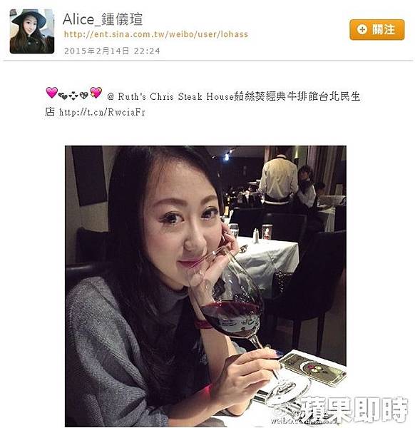 此外,Alice也常貼出在茹絲葵喝紅酒配牛排、文華東方酒店吃松露蘿蔔糕,天冷了就到頂上大啖魚翅燕窩暖暖身等照片,照片大多是個人照,只有一張出現與土豪哥完整的照片,但旁邊還有藝人王陽明等人,但2015年年底之後,土豪妻就未po放閃照。(突發中心/台北報導)