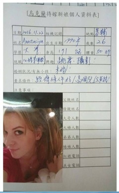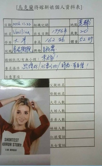 近來有網友討論,有烏克蘭新娘中文履歷在Line群組間流傳。而《卡提諾論壇》中也有網友將這幾張履歷曝光!曝光的四張烏克蘭新娘履歷中,年紀從20歲到37歲都有,身分則有心理系助教、模特兒、美容師等。而對於另一半的要求,有人說要「聰明有愛心」、「時尚有自信」,也有人說要「會英語」、「高個子」,但清一色每個人都要求另一半「經濟條件要好!」