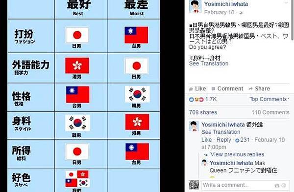 曾於台灣工作3年的日本網友Yosimichi Iwhata,日前於臉書發文,分別以打扮、外語能力、性格、身材、所得、好色等6個項目來評比台港日韓男生。以他認知,其指出日男打扮和所得最好,但外語能力最差;港男外語能力最好,不過身材最差;韓男則是身材最好,個性卻是最差。
