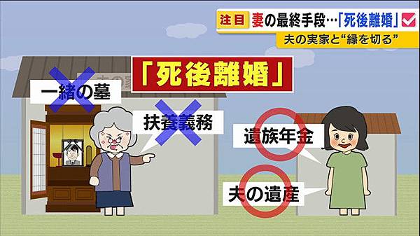 據日本《news-postseven》報導,在配偶過世後提出「姻族関係終了届」,可以終止與配偶血親的姻親關係。雖然無法與死去的丈夫真正離婚,但提出後即可獲得與離婚相似的效果,因此被稱為「死後離婚」。