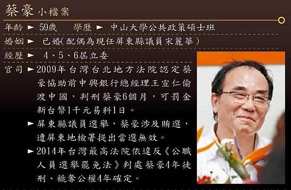 前立委蔡豪曾和妻子宋麗華在屏東政治圈佔有一席之地,如今蔡豪和太太貌合神離,鬧出家暴醜聞;而蔡豪政治生涯的毀滅,追根究柢都出於2009年時他賄選,爾後他在2014年被判3年10個月有期徒刑,關了1年5個月就獲得假釋出獄。
