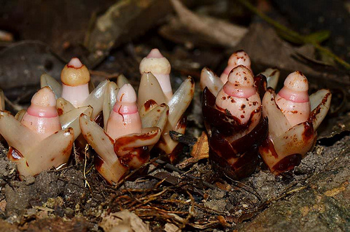 小草本,通常寄生在殼斗科植物的根上,植物體高3~6公分,徑1.5~2公分,呈四稜狀倒卵形,不具葉綠體,根莖粗短,直立莖短,不具分枝。單葉,十字對生,無柄;葉片鱗片狀,長1~2公分,寬0.5~1公分,6~12對,卵狀三角形,厚質;上部幾對葉片較大。花單朵頂生;花被杯狀,高0.5~0.6公分,直徑1.0~1.7公分,口部全緣或微波狀,白色;雄蕊筒部長約0.7公分,花藥環長約0.6公分,花藥極多數,帽狀藥隔長0.2公分,頂端孔裂;子房球形或橢圓形,連花柱長1.2公分,直徑0.9公分,1室,側膜胎座10~20個,不規則地內伸;胚珠倒生,多數,珠被單層;花柱粗短,柱頭短錐形,高0.6~0.7公分,頂端微凹。花期2~3月。果實呈漿果狀;種子細小,多數,具硬殼;果期10月。