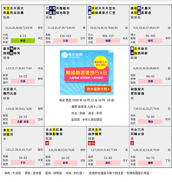 順便一提,天梁坐命的周先生不會晚景淒涼,畢竟天梁有逢凶化吉的意涵或功能。他的年齡在合庫可以做到108年,94年民營化時已領六百多萬的退職金,到108年應該還能再領約三百多萬的退休金及勞保。天梁雖主壽,然而命主天梁在巳為落陷,其壽不長。錢花光之前,人生大概就會結束,所以他不會晚景淒涼,也不會拖累別人。