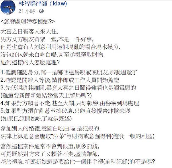 林智群律師表示,雖然此類型詐欺罪刑不重,但「法律上算是意圖騙取"酒菜"等財物或意圖得利(飽食一頓的利益),當然這種案件通常不會判很重,頂多罰錢,可是既然對方來了又賴著不走,新郎新娘還是要給他一個伴手禮(前科紀錄)的不是嗎?」所以他建議,蒐證、然後報警。(即時新聞中心/綜合報導)