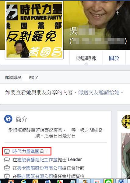 根據她在臉書上的自介,她履歷洋洋灑灑,介紹自己是「時代力量黨團員工」還有「施敏演藝經紀工作室領導」、「美卡國際股份有限公司擔任會計」、「賜吉國際擔任會計」還說自己是「三立電視台擔任演員」,且在她開設的粉絲團中,也確實有一段畫面為她看似在一場高級自助餐廳,還有拍攝器材,看似正在準備拍攝。