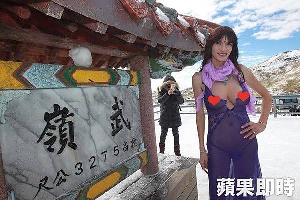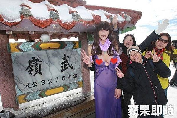 合歡山今天中午左右已經停止下雪,但地上仍積雪約10公分。大奶酥今天穿紫色薄紗、戴著大假奶,在武嶺地標比勝利手勢YA拍照,不少他的粉絲看到,開心靠著他,合拍團體照。