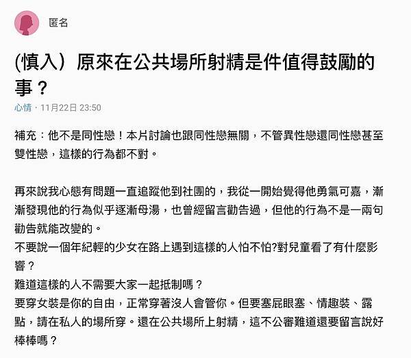 在Dcard上有網友發起討論說道:「要穿女裝是你的自由,正常穿著沒人會管你。但要塞屁X塞、情趣裝、露點,請在私人的場所穿。還在公共場所上射X,這不公審難道還要留言說好棒棒嗎?」,更痛批不應該濫用「做自己」的口號。