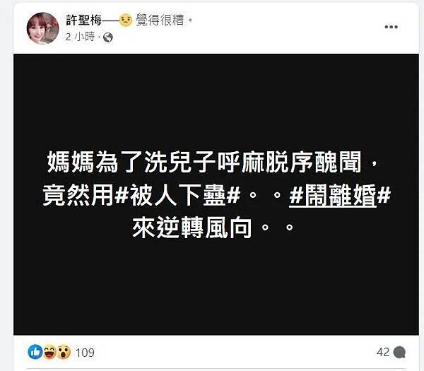 許聖梅1日意有所指地在臉書發文,感嘆「媽媽為了洗兒子呼麻脱序醜聞,竟然用被人下蠱、鬧離婚來逆轉風向。」為了這件事大動肝火。
