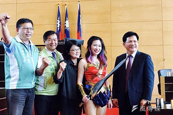 民進黨議員賴佳微今下午變身「神力女超人」,穿戲服拿道具寶劍質詢台中市長林佳龍。林佳龍站在變裝的女議員旁拍照,先問「議員要質詢什麼」,後說「我也會緊張,心跳一百八」。