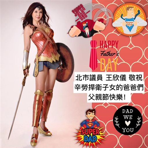 適逢父親節,許多政治人物也在臉書上祝賀選民父親節快樂,而台北市議員王欣儀PO出自己化身「神力女超人」的長輩圖,與選民同慶父親節。此圖一出,讓網友紛紛來朝聖,還留言直呼「比台中那位好看太多啦!」