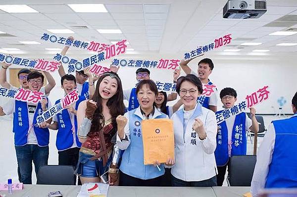左楠區新人李雅芬來勢洶洶,陪同登記的陣仗相當熱鬧,曾任助理的她除了有黃昭順陪同,競選團隊工作人員還扮成「神力女超人」,李雅芬強調:「雖然沒有神力,但我會努力、為高雄,為左楠窮盡洪荒之力!」(林宏聰)