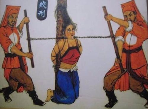 這個刑法有點特殊,不是把人吊起來,而是用繩子纏住犯人脖子,然後有兩個人拽兩頭,直到犯人斷氣為止。