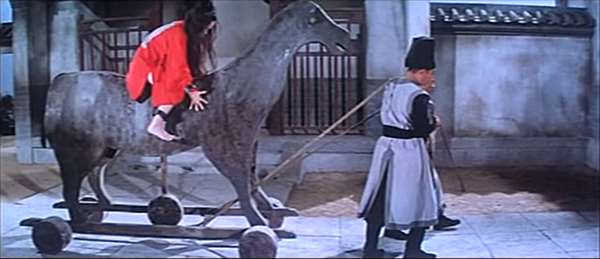 木驢結構:根據有些小說的描述,改進過的木驢下面有四個輪子可以推著走。內藏偏心輪,可在女犯遊街時帶動圓木條上下移動、反覆撞擊女陰,使其在示眾過程中感受類似被強姦的痛楚。